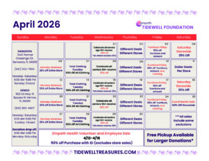 Tidewell Treasures is a resale shop benefiting the Tidewell Foundation in its support of Tidewell Hospice. Proceeds from all items sold at Tidewell Treasures go to the Tidewell Foundation, which provides grants to Tidewell Hospice for charity care, complementary patient services, and free grief services for more than 8,000 clients throughout Charlotte, DeSoto, Manatee, and Sarasota counties.